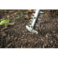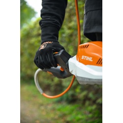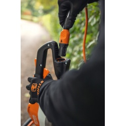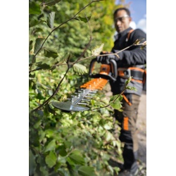 Akumulatorowe nożyce do żywopłotu Stihl HSA 130 R. Zasilane z zewnętrznego akumulatora. Zasilanie akumulatorowe z kieszeni do pasa AP z przewodem zasilającym.
