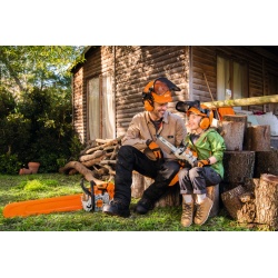 Zabawka pilarka spalinowa Stihl z baterią w zestawie.